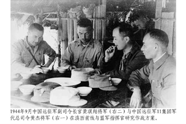 1944年9月中国远征军司令部副司令长官黄琪翔将军(右二)与中国远征军11集团军代总司令黄杰将军(右一)在滇西前线与盟军指挥官研究作战方案。